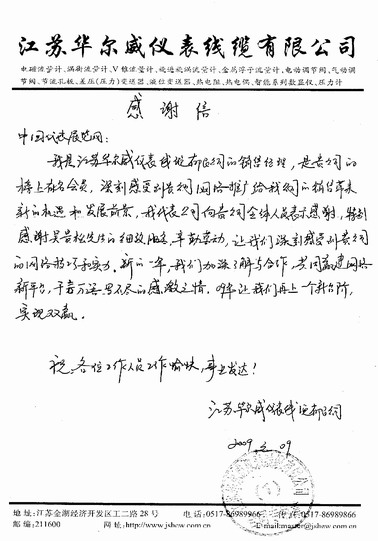 江蘇華爾威儀表線纜有限公司08年在網(wǎng)絡推廣方面取得了斐然的成績,網(wǎng)絡推廣給公司的銷售帶來新的機遇和發(fā)展前景。公司在網(wǎng)絡推廣中的突出表現(xiàn)得益于中國儀表展覽網(wǎng)的大力支持和周到服務,特致信對中國儀表展覽網(wǎng)的技術(shù)實力和行業(yè)實力表示了充分的肯定,對相關(guān)工作人員予以衷心的感謝,并對09年的合作和前景充滿了信心。