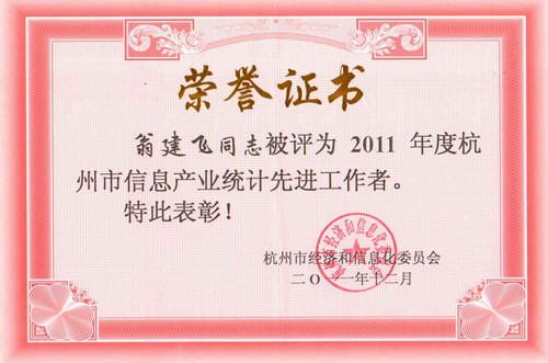 2011年12月23日,杭州市經濟系信息化委員會辦公室發文,表彰了全市50位“2011年杭州市信息產業統計先進工作者”,浙江興旺寶明通網絡有限公司財務主管翁建飛獲得“先進工作者”殊榮。
