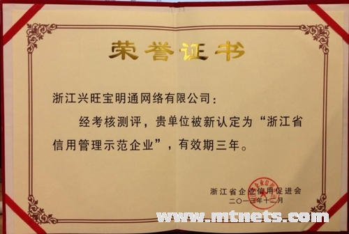 日前,浙江興旺寶明通網絡有限公司通過“浙江省信用管理示范企業”的審核認定,榮譽資質又添一項。誠信為本是企業文化的第一條,也是最重要的一條,對社會誠信,對客戶誠信,對同事誠信是所有明通人的核心價值觀。