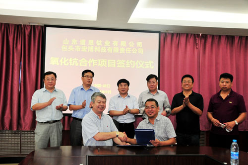 9月13日,山東道恩鈦業有限公司與包頭市宏博科技有限責任公司合作的“鈦富集物萃取項目”舉行了奠基儀式,道恩集團董事長于曉寧及雙方主要領導出席儀式并為項目培土奠基。該產品屬于采用新工藝、新技術實施的循環經濟工程,注重節能環保、資源利用,預計在今年年底將建成投產。該產品廣泛應用于航天、電子、冶金和醫療等高新技術領域。