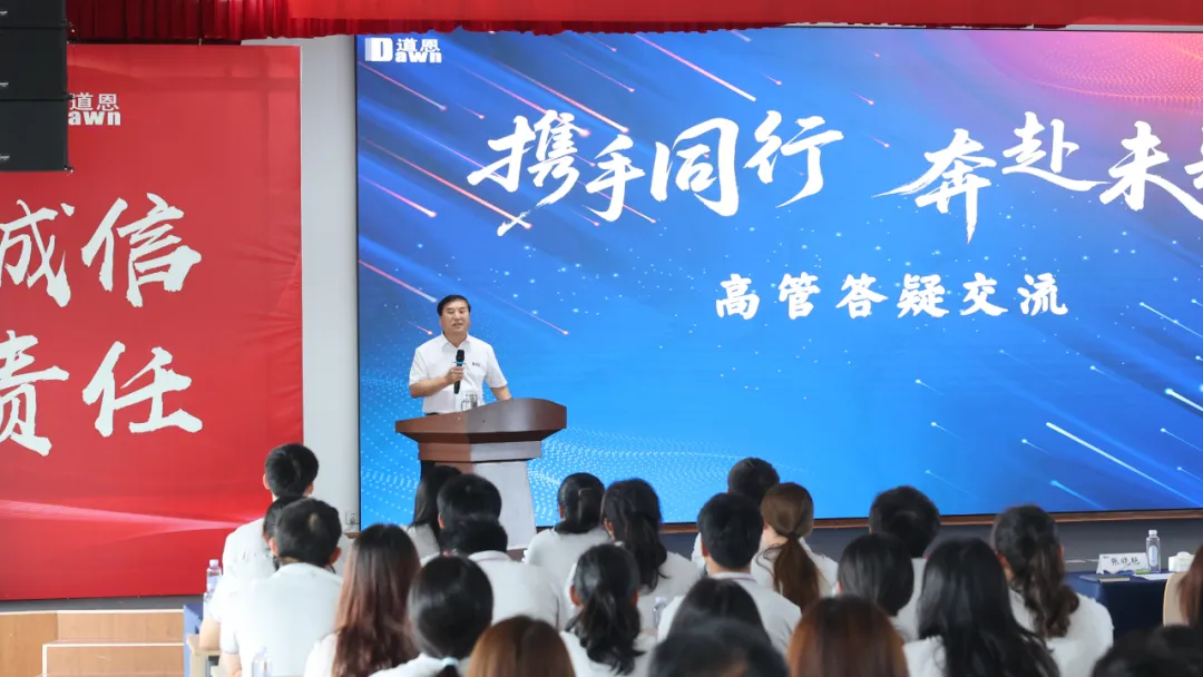 “34年前,我與你們年齡相仿,帶領5個人的小團隊踏上了創業征程,一路披荊斬棘,風雨兼程,在改革開放的大潮中,搶抓發展機遇,帶領道恩完成了從無到有、從小到大、從弱到強的華麗蛻變。”道恩集團董事長、總裁于曉寧與新員工分享了創業歷程,闡述了未來產業規劃、戰略目標及海內外研發布局。他強調,人才是企業競爭的核心,青年人肩負時代重任。于曉寧董事長勉勵新員工,要常懷感恩之心,用感恩的心態對待父母、對待家庭、對待企業、對待社會、對待祖國;要強化自身為人處世的能力,心懷正念,培育一顆善良、純潔、上進的心靈,努力為企業、國家和社會創造價值。