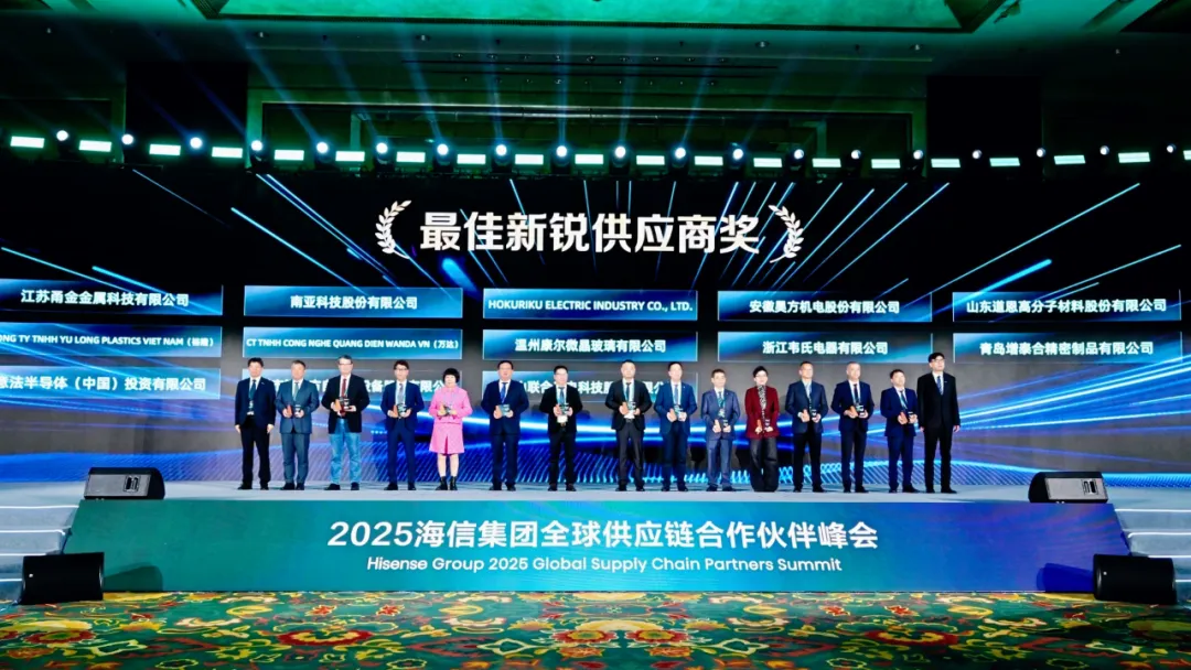 10月16日,在青島舉行的2025海信集團全球供應鏈合作伙伴峰會上,道恩股份榮獲“最佳新銳供應商獎”,該公司常務副總經理王澤方上臺領獎并參加技術開發項目簽約儀式,研發總監王紅圍繞綠色低碳材料作專題演講,展示了專家型企業形象,提升了道恩品牌知名度、美譽度和影響力。