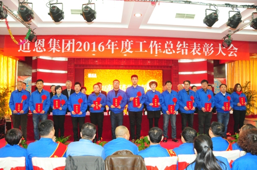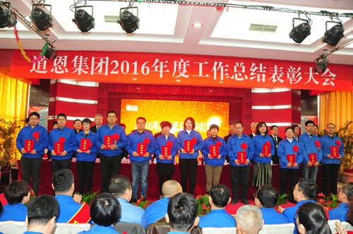 1月24日上午,道恩集團2016年度總結表彰大會在道恩湖畔酒店三樓多功能廳隆重舉行。集團公司董事長于曉寧、總裁索延輝出席大會并發表講話。
