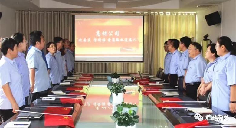 9月30日上午,高材公司舉辦以“迎國慶、學(xué)講話、愛崗敬業(yè)道恩人”為主題的喜迎國慶活動。活動中,該公司總經(jīng)理臧云濤帶領(lǐng)與會人員學(xué)習(xí)于曉寧董事長在集團(tuán)公司慶祝新中國成立70周年主題文化活動上的講話,觀看了大型愛國勵志短片《國家》,該公司班子成員共同歌唱《國家》,最后共同喊出道恩“三共”口號,表達(dá)了對國家、對道恩的深情祝福。