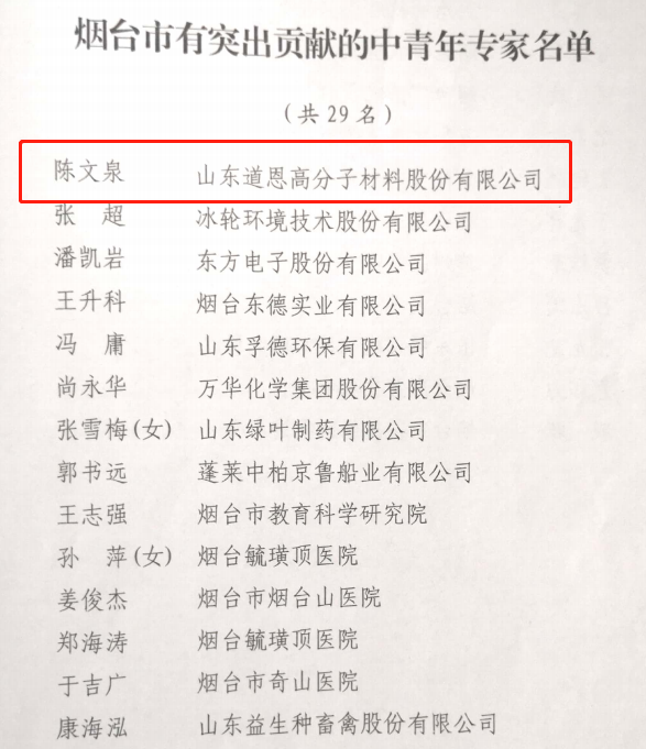 日前,煙臺市政府公布了煙臺市有突出貢獻的中青年專家人員名單,道恩股份總監、副總工程師陳文泉名列其中。這是繼道恩股份總監劉曉平之后,道恩又一位科研工作者獲此殊榮。
