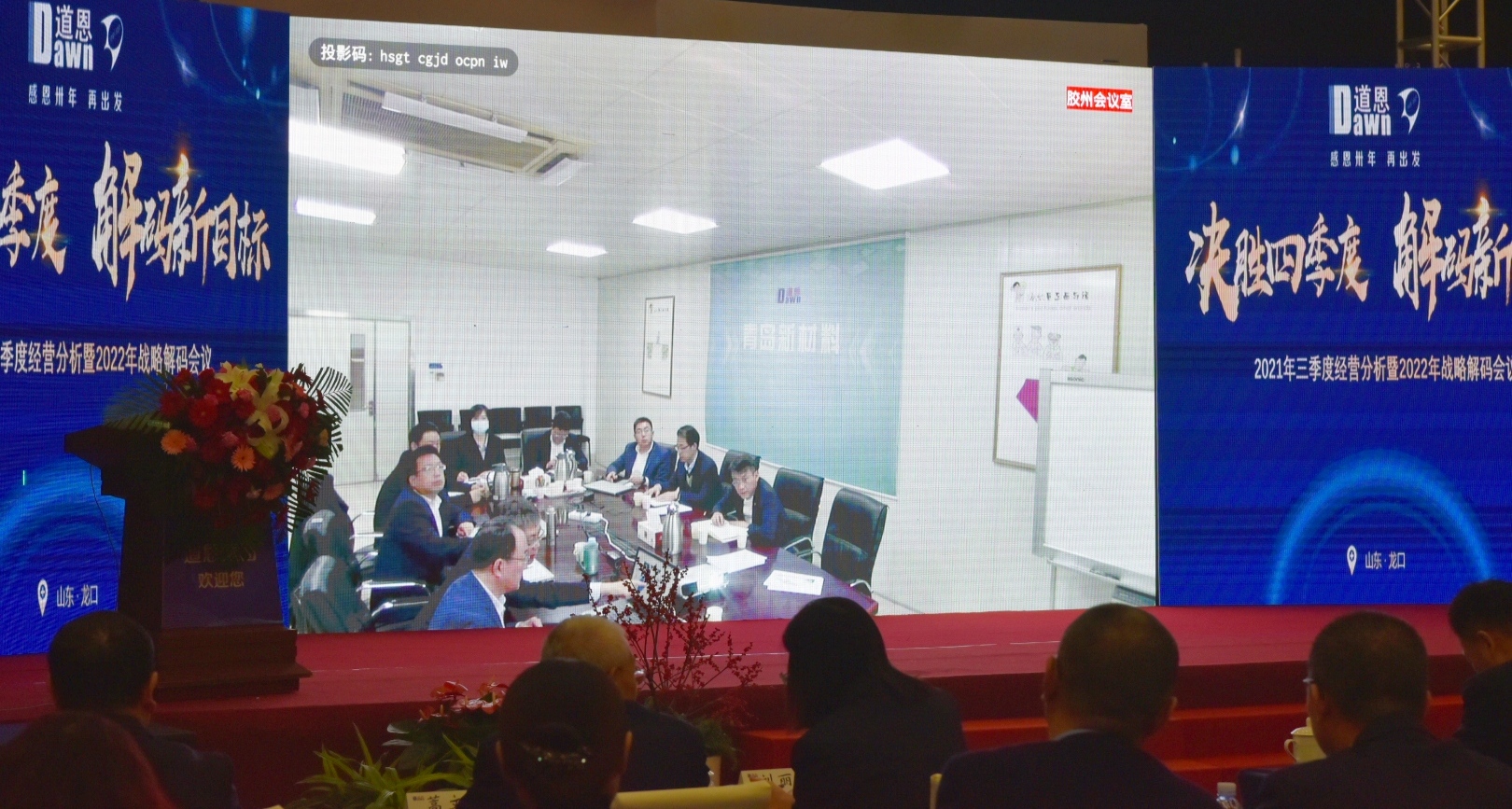 10月30日至31日,道恩集團在道恩湖畔酒店舉行2021年三季度經營分析暨2022年戰略解碼會議。會議旨在總結過去,表彰先進、激勵士氣、鼓舞干勁,部署四季度及明年工作,動員廣大員工認清形勢、增強信心,共同探討公司明年的發展目標。道恩集團董事長、總裁于曉寧出席會議并作重要講話。