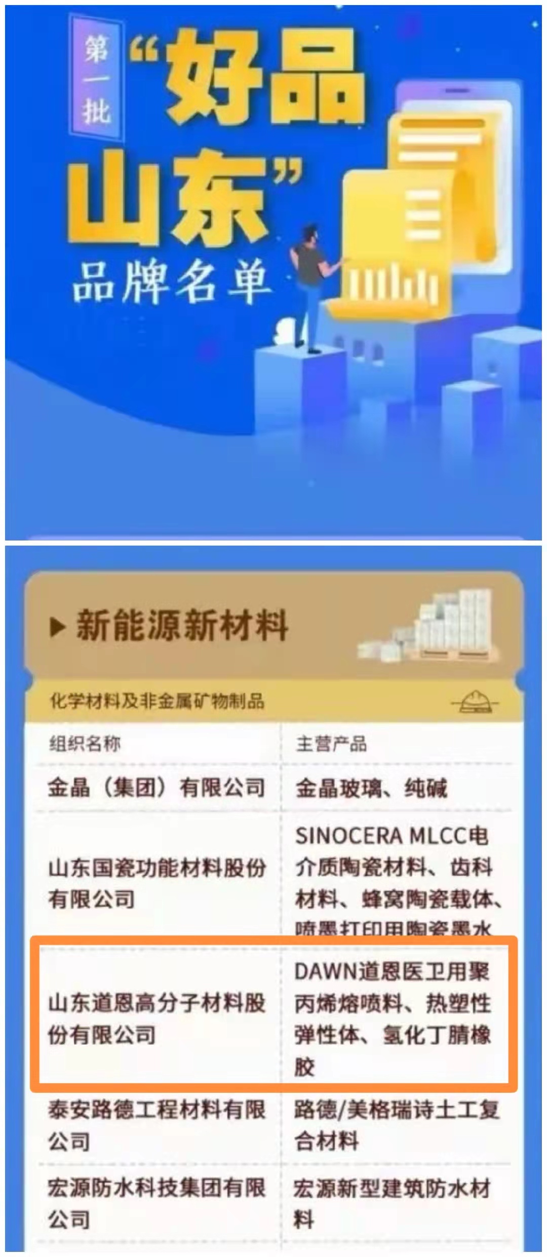 3月2日上午,山東省發布第一批“好品山東”品牌名單,道恩股份“DAWN道恩醫衛用聚丙烯熔噴料、熱塑性彈性體、氫化丁腈橡膠”產品名列其中,充分彰顯了道恩的品牌知名度和影響力。