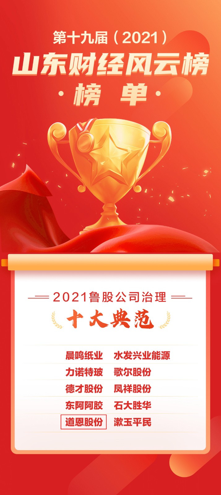 6月28日下午,“奮力走在前——第十九屆(2021)山東財經風云榜”頒獎盛典在濟南舉行。道恩股份榮獲“2021山東財經風云榜魯股公司治理十大典范”。